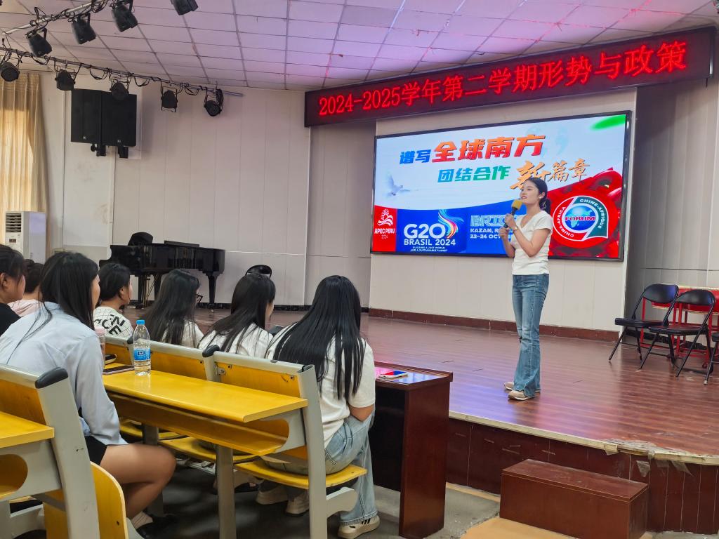 本次专题讲座以教育部“关于印发2025年春季学期全国高校‘形势与政策’教学要点的通知”里教学要求为依据,深入贯彻落实党的二十大和二十届三中全会精神,结合教育部联合举办的全国高校“形势与政策”集体备课会优质资源,聚焦“探寻新时期中美正确相处之道”和“谱写全球南方团结合作的新篇章”为核心话题,为学生讲述党和国家在“中美正确相处之道”“谱写全球南方团结合作”方面的政策和形势,引导学生紧跟时代步伐,进一步增强学生的自信与认同感,坚定不移听党话、跟党走,努力成长为堪当强国建设、民族复兴重任的时代新人。