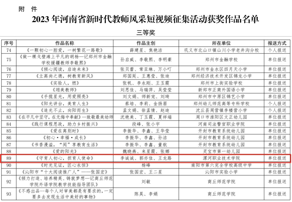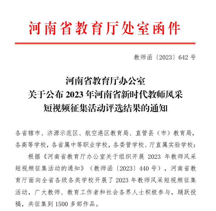近日,河南省教育厅办公室下发《关于公布2023年河南省新时代教师风采短视频征集活动评选结果的通知》,william希尔思想政治理论部报送作品《守育人初心,担育人使命》荣获三等奖。
