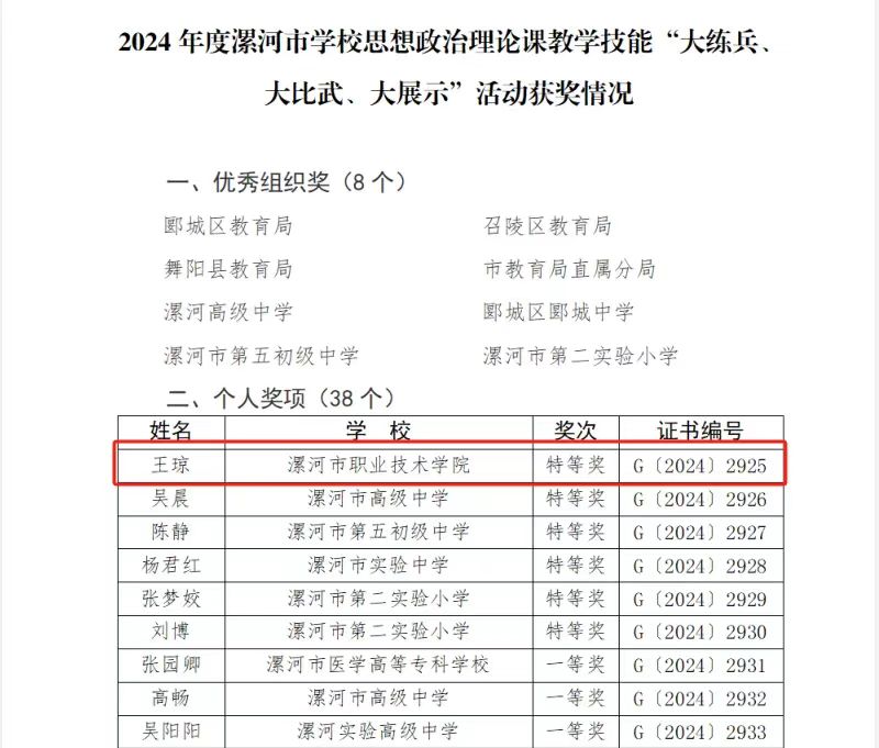 近日,中共漯河市委教育工作委员会、漯河市教育局公布了2024年度全市学校思想政治理论课教学技能"大练兵、大比武、大展示"活动获奖情况,英国威廉集团王琼、李果两位教师分别荣获特等奖和二等奖。
