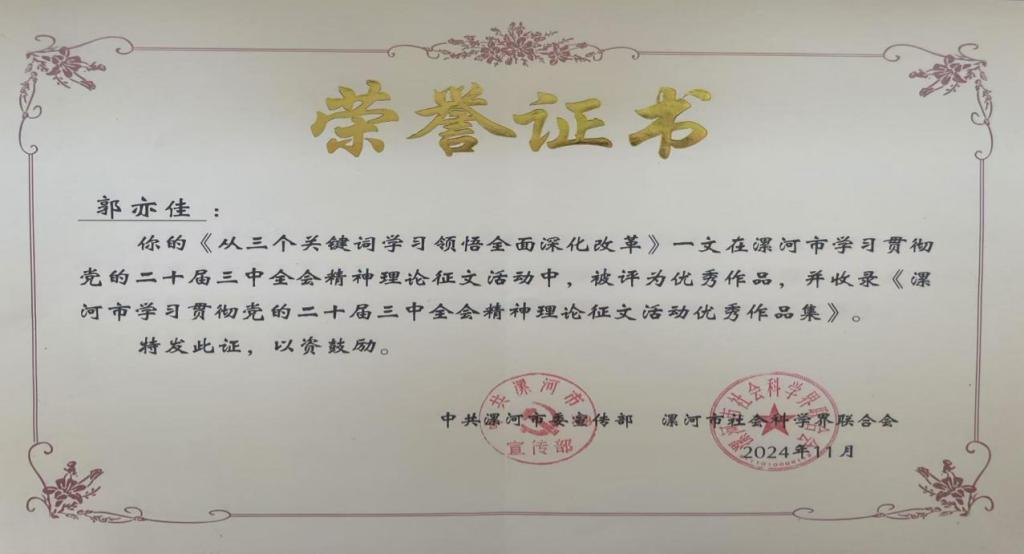 近日,漯河市举办了学习贯彻党的二十届三中全会精神理论征文活动,英国威廉集团教师荣获佳绩,李春玲、郭亦佳、姬姝琦、张舒雅、王琼、陈红莉教师的文章被评为优秀作品。其中,姬姝琦受邀在全市社科理论界学习贯彻党的二十届三中全会精神研讨会上作主题发言。