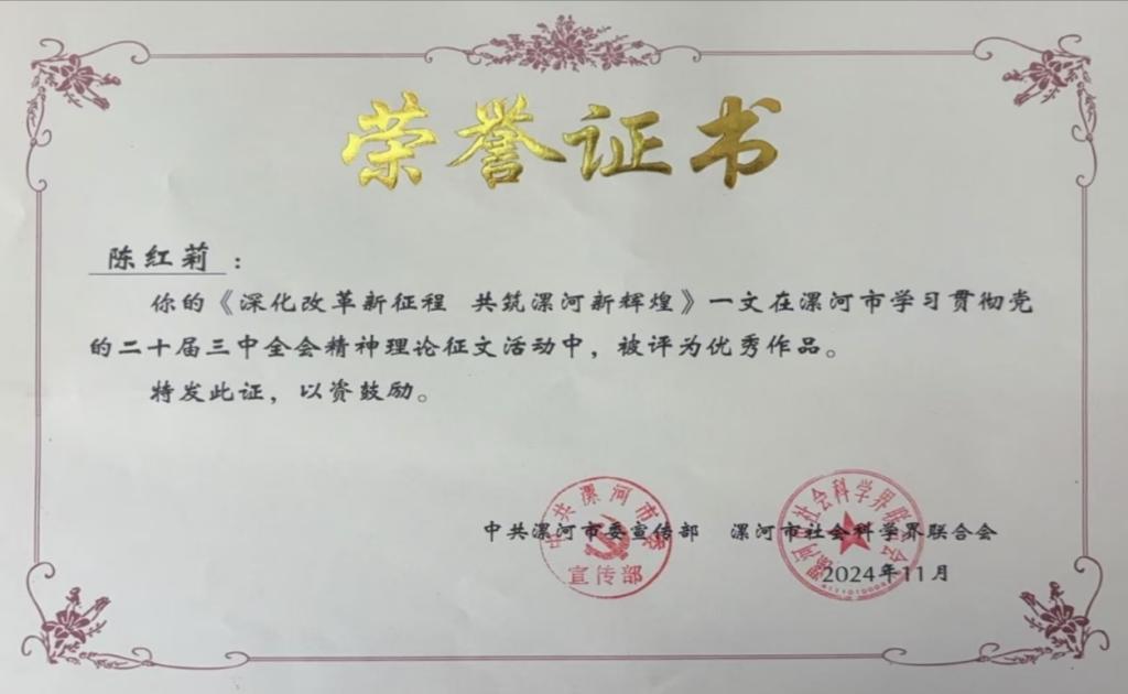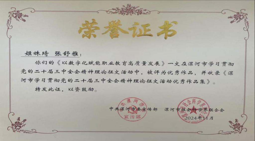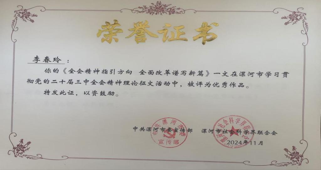近日,漯河市举办了学习贯彻党的二十届三中全会精神理论征文活动,英国威廉集团教师荣获佳绩,李春玲、郭亦佳、姬姝琦、张舒雅、王琼、陈红莉教师的文章被评为优秀作品。其中,姬姝琦受邀在全市社科理论界学习贯彻党的二十届三中全会精神研讨会上作主题发言。