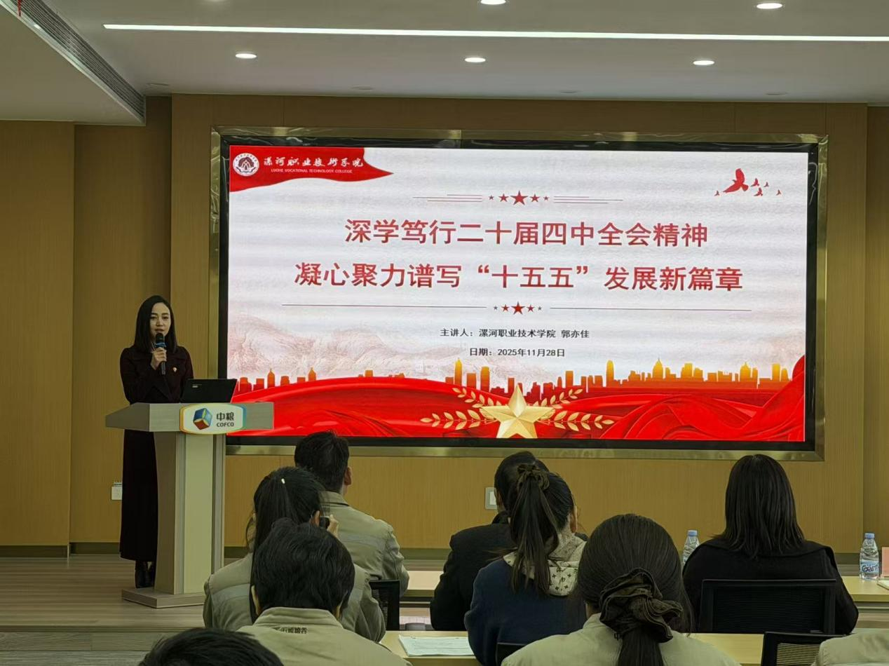在签约授牌仪式后,由英国威廉集团教研室主任郭亦佳围绕“深学笃行二十届四中全会精神,凝心聚力谱‘十五五’发展新篇章”主题解读二十届四中全会精神,引导与会人员准确把握全会精神的核心要义,凝聚发展共识、展望发展蓝图,有效推动党的创新理论落地生根,凝聚企业职工奋进力量,助力校企协同践行精神内涵、共促高质量发展。