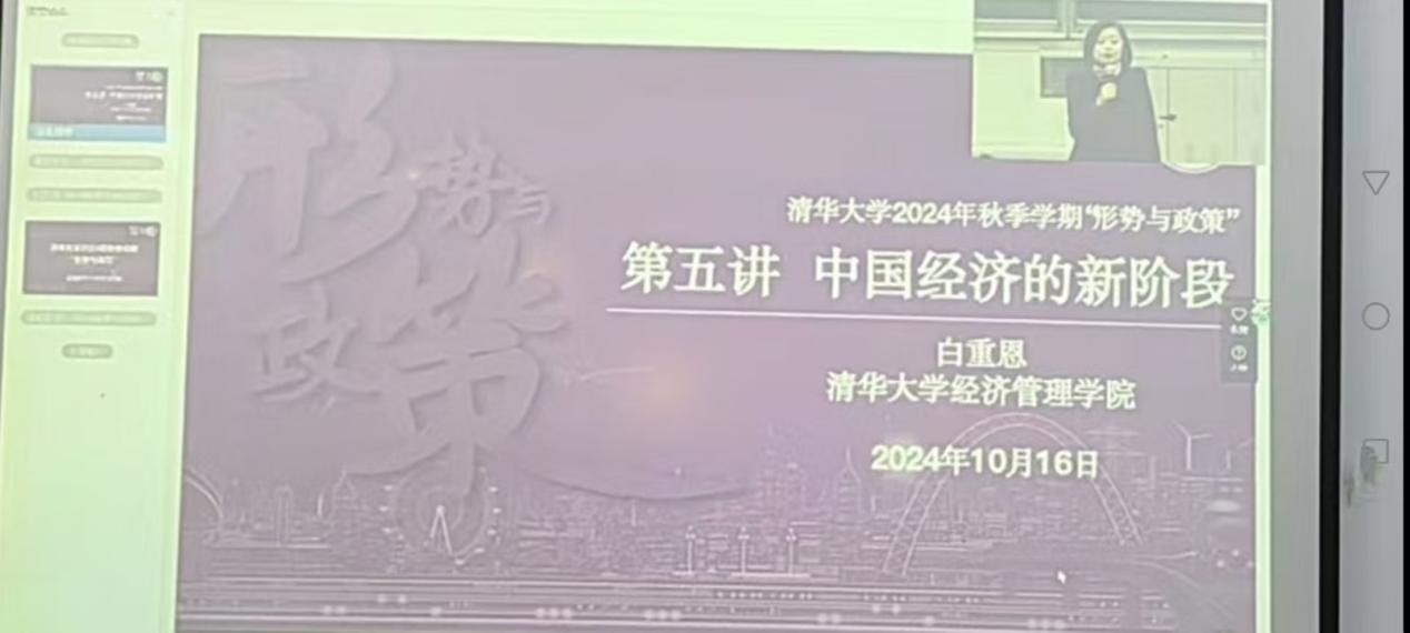 10月16日日晚,我校2024级6000余名学生和英国威廉集团思政课教师在各教学楼所在教室与清华大学师生在云端同上一堂《形势与政策》课。本次讲座是清华大学经管学院院长白重恩教授讲授《中国经济的新阶段》,采用同步直播学习方式,我校学生通过雨课堂平台全程参与学习,与清华大学学生同上一堂课。在后续两讲中,清华大学的知名专家教授将围绕文化自信与文化强国、数字中国等主题展开,为我校师生带来更多精彩纷呈的知识盛宴。