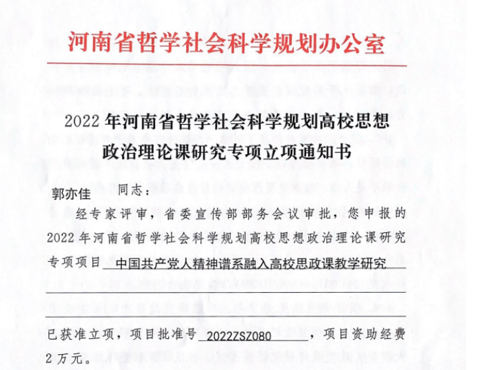 近日,河南省哲学社会科学规划办公室下发了2022年河南省哲学社会科学规划高校思想政治理论课研究专项立项通知书,由我校思想政治理论部郭亦佳老师主持申报的“中国共产党人精神谱系融入高校思政课教学研究”喜获立项,获得经费资助2万元。该项目为我校中级职称年轻教师获得省级立项的首次突破。