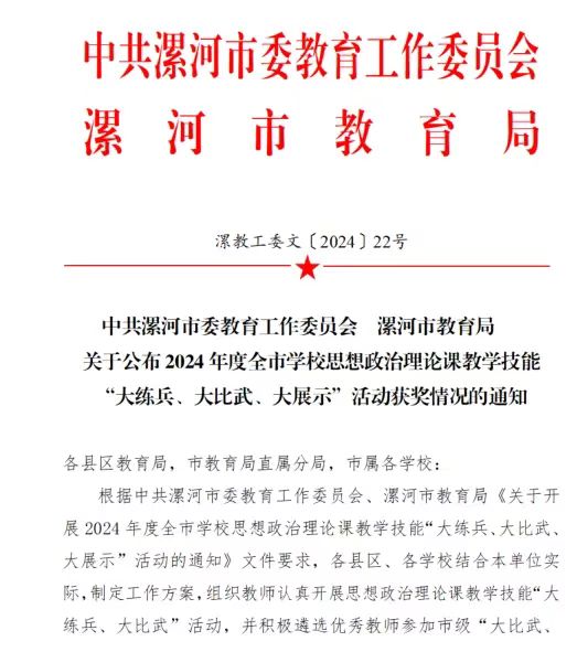 近日,中共漯河市委教育工作委员会、漯河市教育局公布了2024年度全市学校思想政治理论课教学技能"大练兵、大比武、大展示"活动获奖情况,英国威廉集团王琼、李果两位教师分别荣获特等奖和二等奖。